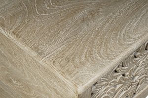 Carved floral motifs in solid wood offer artisan detail and refined texture